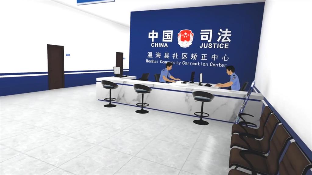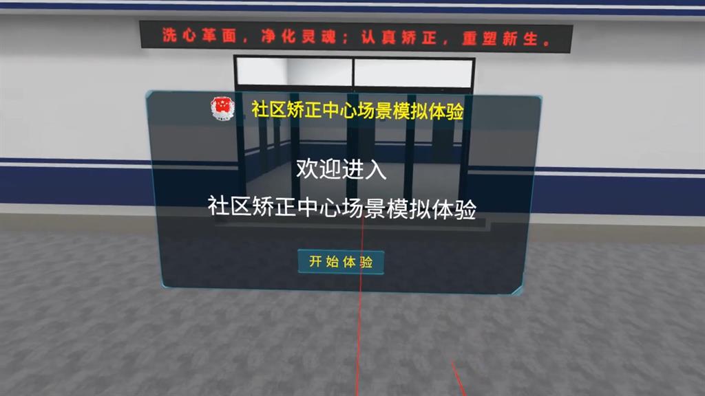 進(jìn)入VR場(chǎng)景,體驗(yàn)者站在社區(qū)矯正中心大門前,點(diǎn)擊手柄即可進(jìn)入內(nèi)部。大廳內(nèi),系統(tǒng)語(yǔ)音隨即介紹中心的主要職責(zé)與區(qū)域劃分。隨后,體驗(yàn)者可自由漫游至各功能室,系統(tǒng)會(huì)詳細(xì)介紹每室的功能及在社區(qū)矯正中的作用。此外,大廳還設(shè)有互動(dòng)答題環(huán)節(jié),增強(qiáng)體驗(yàn)趣味性與知識(shí)性。