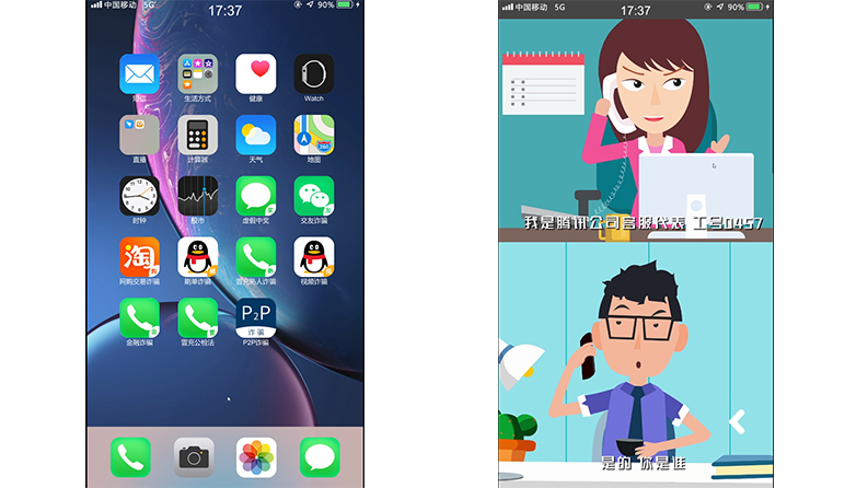 本系統(tǒng)運用了虛擬仿真技術(shù),模擬手機操作系統(tǒng),將9大常見詐騙案例,通過手機應(yīng)用圖標(biāo)的方式,展示 給體驗者,并能觸發(fā)對應(yīng)的案例。案例包含:冒充管理人員、冒充熟人詐騙、虛假中獎、交友詐騙、刷單詐騙、QQ視頻詐騙、網(wǎng)上交易詐騙、金融詐騙、P2P 詐騙案例;體驗者在體驗案例的過程中,將遇到一些重要的選擇,并將引導(dǎo)你進(jìn)入之后的情節(jié),最后將有虛擬民警,講解防范此類詐騙的技巧和要點。