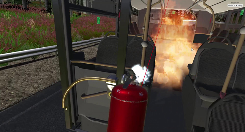 4-2、體驗者通過位移移動靠近客車后方起火位置,通過手柄操作已拾取的滅火器針對客車后部著火位置噴射滅火;