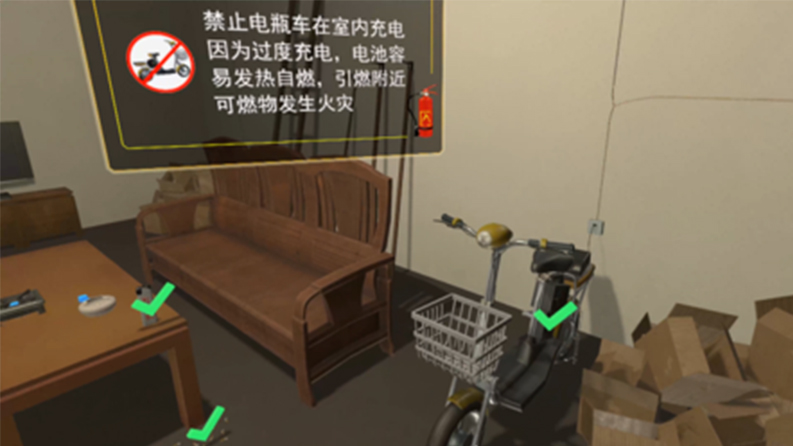 農(nóng)村建筑大多為毗連結(jié)構(gòu),屋內(nèi)木質(zhì)物品較多,極易點(diǎn)燃。體驗(yàn)者需根據(jù)提示,找出容易引起火災(zāi)的物品和生活習(xí)慣,然后在模擬發(fā)生火災(zāi)時(shí)如何逃生。
