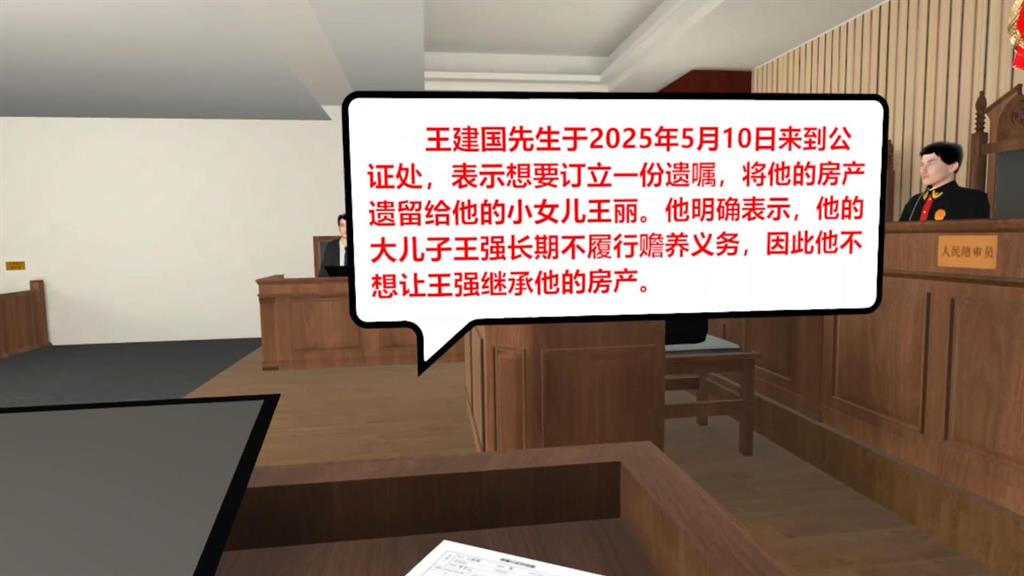 模擬成為一位公證員,體驗(yàn)遺囑公證、出庭作證等公證業(yè)務(wù)流程,讓用戶在虛擬環(huán)境中深入了解公證業(yè)務(wù)的各個(gè)過(guò)程,提高業(yè)務(wù)理解和操作能力。體驗(yàn)完成后將進(jìn)行答題測(cè)試,以檢驗(yàn)用戶對(duì)公證流程的理解程度及法律知識(shí)掌握情況。