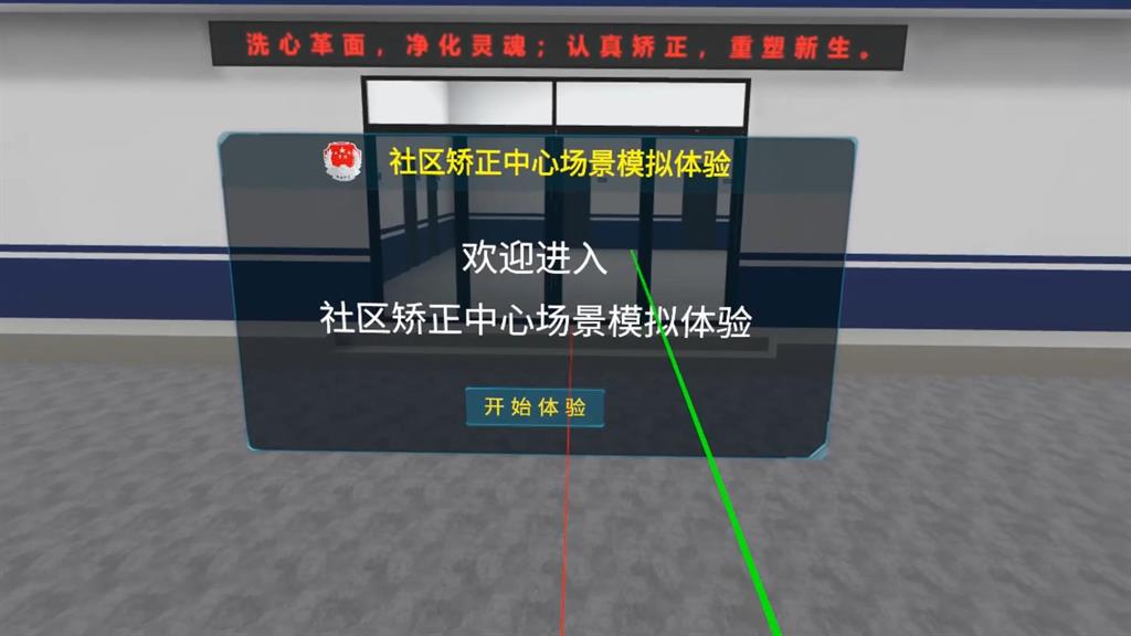 進(jìn)入VR場(chǎng)景,體驗(yàn)者站在社區(qū)矯正中心大門前,點(diǎn)擊手柄即可進(jìn)入內(nèi)部。大廳內(nèi),系統(tǒng)語(yǔ)音隨即介紹中心的主要職責(zé)與區(qū)域劃分。隨后,體驗(yàn)者可自由漫游至各功能室,系統(tǒng)會(huì)詳細(xì)介紹每室的功能及在社區(qū)矯正中的作用。此外,大廳還設(shè)有互動(dòng)答題環(huán)節(jié),增強(qiáng)體驗(yàn)趣味性與知識(shí)性。