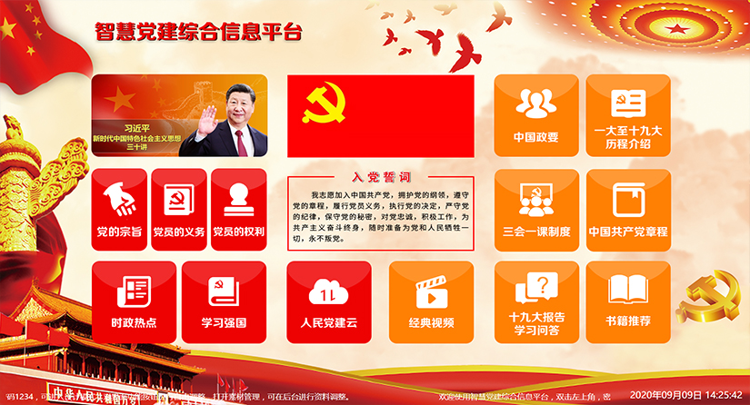 在雙屏多媒體查閱設(shè)備上,可以查閱黨的輝煌歷程、黨的重大事跡、互動搶答、紅色電影、紅色書籍、學(xué)習(xí)強(qiáng)國、時政熱議、入黨誓詞、三會一課制度等相關(guān)內(nèi)容。