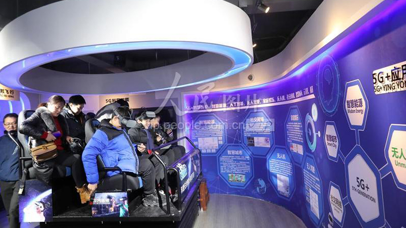 2021年1月1日,市民在江蘇南通科技館5G+展區(qū)參觀體驗。南通科技館新設(shè)的5G+展區(qū)在2021年元旦小長假正式與觀眾見面,新奇的體驗設(shè)備吸引了眾多市民參觀體驗5G動感平臺、VR海底漫游、5G模擬飛行駕駛等項目,并參觀科技館機(jī)器人表演。