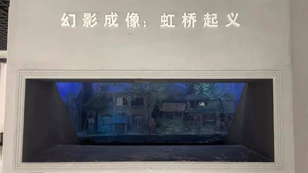 幻影成像系統(tǒng),呈現(xiàn)虹橋起義的內(nèi)容展現(xiàn)。利用多機(jī)多方位攝像技術(shù)及人眼視覺心理特性,再將所拍攝區(qū)域?qū)⑼队爱嬅嫱渡湓谔刂泼浇椴A希c實景模型結(jié)合,合成最終3D畫面,演繹出虹橋起義故事。