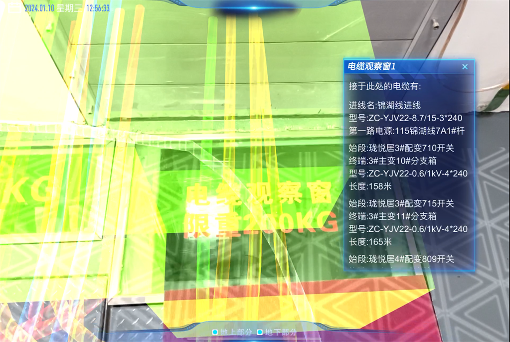 巡檢模式下,ipad的拍攝模式一直打開,然后工作人員拿著ipad于室外指定區(qū)域行走,對(duì)著展示的電纜井或電纜管線,點(diǎn)擊對(duì)應(yīng)模型,可以打開數(shù)據(jù)面板或電纜截面圖(電纜井為數(shù)據(jù)面板,電纜管線為截面圖),點(diǎn)擊截面圖上標(biāo)識(shí)名稱的管線截面,可以打開對(duì)應(yīng)的管線數(shù)據(jù)面板。